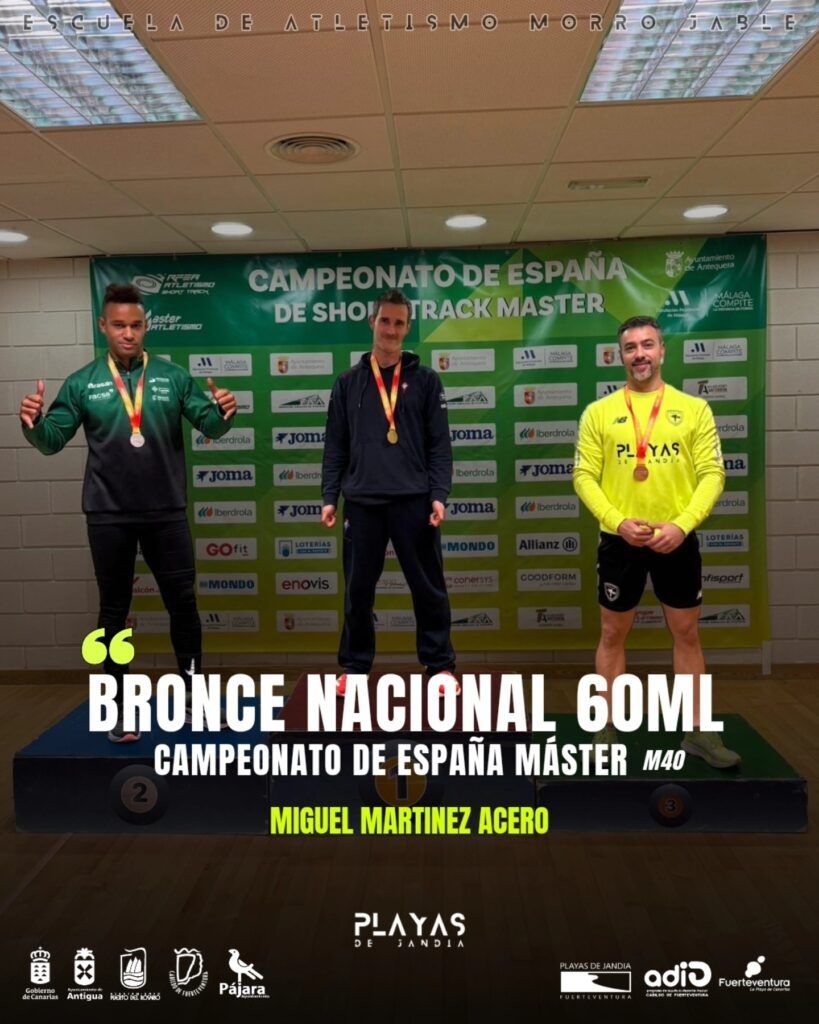El atleta de la Escuela de Atletismo Morro Jable Playas de Jandía, Miguel Martínez Acero, ha conseguido la medalla de bronce en los 60 metros lisos (categoría M40) durante el Campeonato de España Máster en pista cubierta, celebrado en Antequera (Málaga).