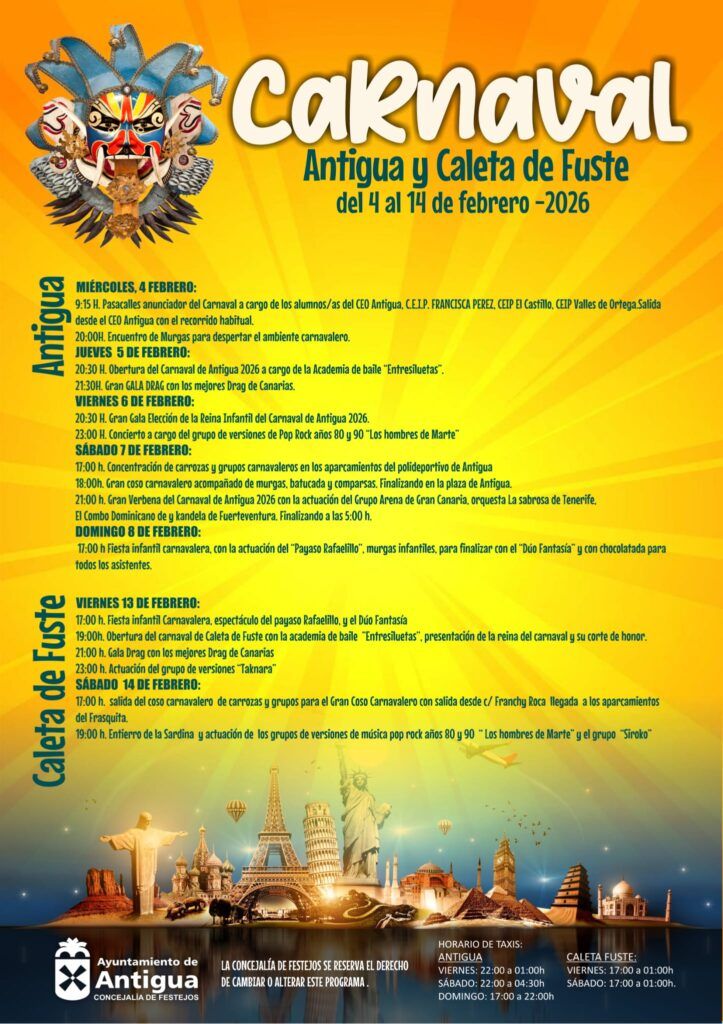 El Carnaval 2026 tendrá lugar del 4 al 14 de febrero, celebrando una programación principal en el primer fin de semana en Antigua y en el segundo en Caleta de Fuste, reuniendo actuaciones, pasacalles, coso carnavalero, verbenas y Gala Drag, afirma el concejal de Festejos, Pedro Armas Martín.