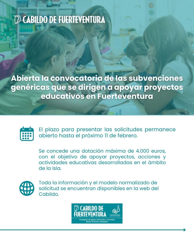 El Cabildo de Fuerteventura, a través de la Consejería de Educación, ha abierto la convocatoria de subvenciones genéricas destinadas a apoyar proyectos educativos que se desarrollen en la Isla. El plazo para presentar solicitudes permanecerá abierto hasta el próximo 11 de febrero.