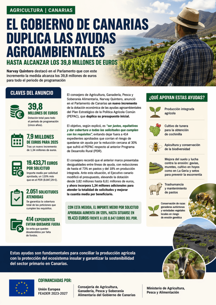 El consejero de Agricultura, Ganadería, Pesca y Soberanía Alimentaria del Gobierno de Canarias, Narvay Quintero, anunció en el Parlamento de Canarias un nuevo incremento de la dotación económica de las ayudas agroambientales del Plan Estratégico de la Política Agrícola Común (PEPAC), una medida que duplica el presupuesto inicialmente previsto para esta línea de subvenciones.