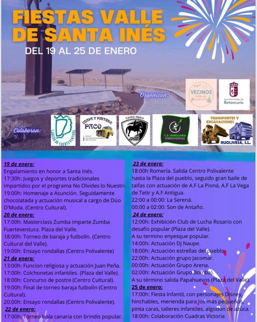 El Valle de Santa Inés se prepara para vivir una semana llena de tradición, música, deporte y convivencia con la celebración de sus esperadas fiestas en honor a Santa Inés, que tendrán lugar del 19 al 25 de enero. Un programa variado y pensado para todas las edades, donde vecinos y visitantes podrán disfrutar de actividades culturales, deportivas, religiosas y festivas en un ambiente familiar y acogedor.