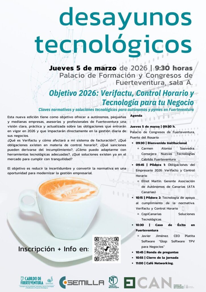 El Palacio de Formación y Congresos de Fuerteventura acogerá el próximo jueves 5 de marzo de 2026, a las 9:30 horas, una nueva edición de los Desayunos Tecnológicos, un encuentro dirigido a autónomos, pequeñas y medianas empresas, asesorías y profesionales de la isla que buscan anticiparse a los cambios normativos previstos para el próximo año.