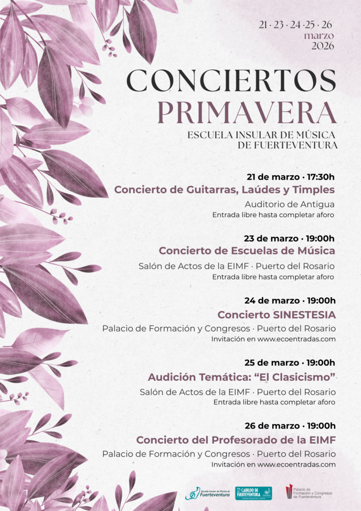 La Escuela Insular de Música de Fuerteventura (EIMF), dependiente del Cabildo de Fuerteventura, pone en marcha por primera vez los Conciertos de Primavera, un nuevo ciclo musical que se desarrollará del 21 al 26 de marzo en diferentes espacios culturales de Puerto del Rosario y Antigua.