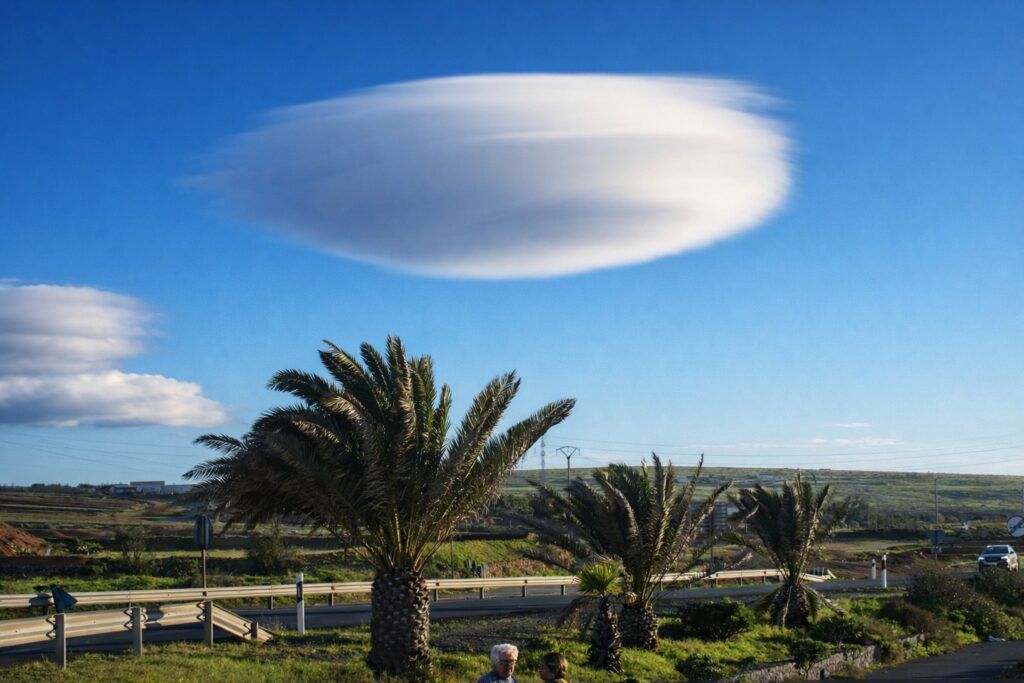 Sobre el paisaje majorero, entre palmeras mecidas por la brisa y campos abiertos que respiran historia y tradición, una nube solitaria adoptaba una forma casi perfecta, como si alguien la hubiera dibujado cuidadosamente sobre el azul infinito. Allí estaba, flotando con serenidad, recordándonos que la belleza no siempre necesita artificios.
