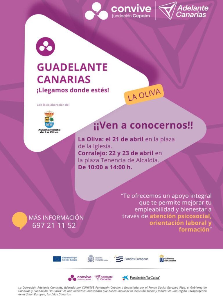 El Ayuntamiento de La Oliva acogerá del 21 al 23 de abril el desarrollo del proyecto Guadelante Canarias, una iniciativa enmarcada en la Operación Adelante Canarias y liderada por Fundación Cepaim, que cuenta con financiación del Fondo Social Europeo Plus, el Gobierno de Canarias y Fundación La Caixa.