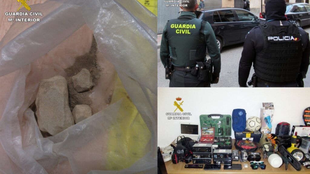En los registros practicados se intervinieron 3.400 euros en efectivo, 22 gramos de cocaína, 3.440 gramos de hachís, 150 gramos de polen de hachís, 17 gramos de marihuana, cinco básculas de precisión y numerosos útiles destinados al almacenamiento, manipulación y dosificación de la droga.